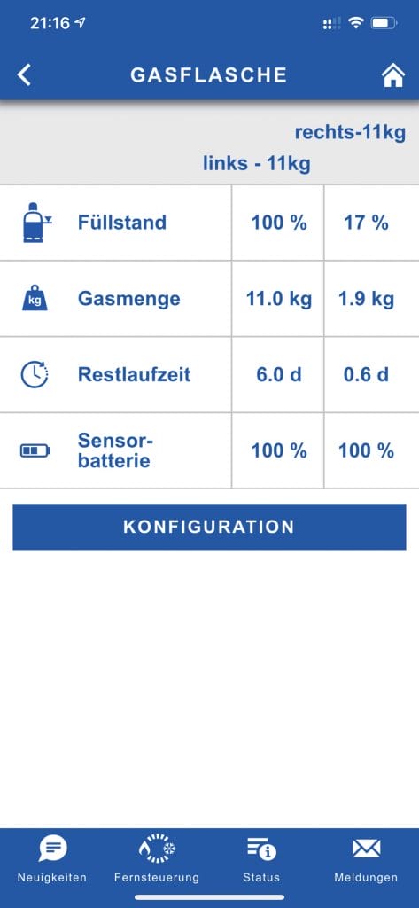 Tabellarisch wird der Füllstand in %, die Gasmenge in kg, die berechnete Restlaufzeit sowie der Batteriestand dargestellt. Die berechnete Restlaufzeit gibt an, wie lange das Gas beim aktuellen Verbrauch noch reicht, in meinem Fall etwas mehr als ein halber Tag bei 1,9 kg Restgas. Eine volle Flasche soll damit dann 6 Tage reichen. Also 12 Tage mit 22 kg Gas.