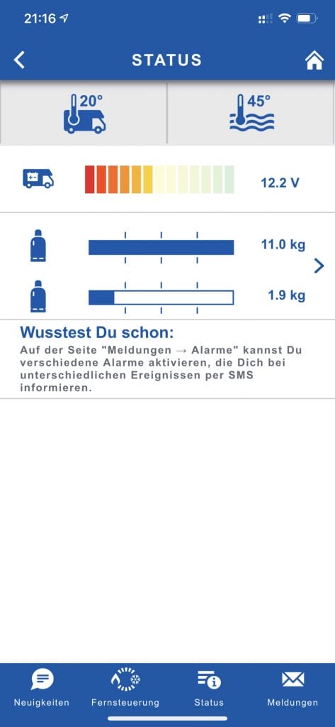 Im Statusbereich der App kann man auf einem Blick die Innenraum- und Wassertemperatur erkennen sowie den Status der Batterie. Wenn man dann noch das Truma Level Control verbaut hat sieht man den Füllstand der Gasflasche(n).