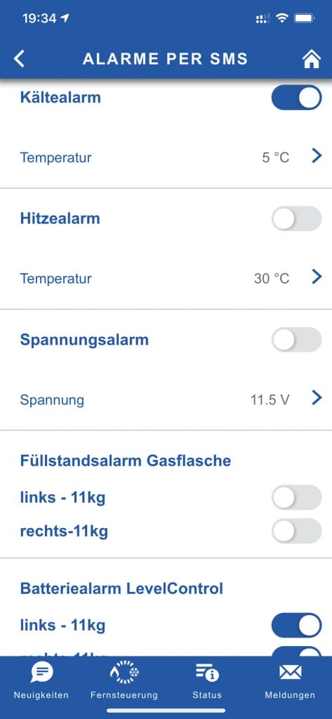 Für mich besonders wichtig ist der Füllstandsalarm der Gasflaschen. Leider kann man nicht einstellen bei wieviel % bzw. Rest kg der Alarm versendet werden soll. Wichtig: Wurde der Alarm einmal ausgelöst, so muss man diesen wieder über die App aktivieren.