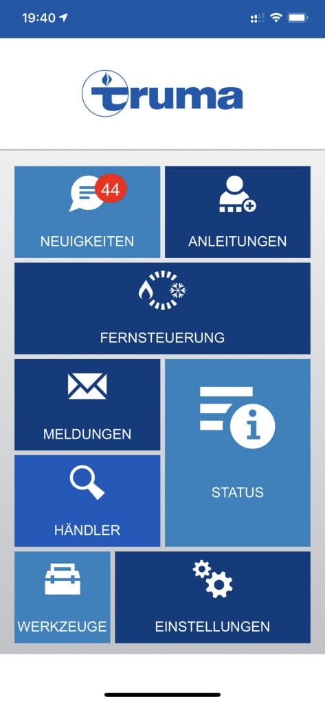 Startet man die App, dann „erschlägt“ einen eine Übersichtsseite, mit allen Möglichkeiten, die die App bietet. Angefangen von den 44 News, die jedesmal neu von der Website geladen werden. Sehr nützlich und schon öfters gebraucht ist der Link zu den Anleitungen von Truma. Dort findet man schnell die gesuchte Anleitung für sein Produkt (wobei vieles wirklich selbsterklärend ist).