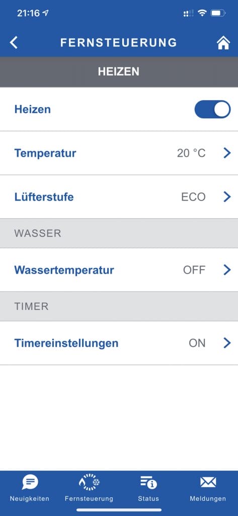 Im Status Heizen kann man komfortabel die Wunschtemperatur vom Innenraum einstellen, ebenso die Lüfterstärke. Die Wassertemperatur kann unabhängig vom Heizen definiert werden. Zu guter letzt kann man auch den Timer einstellen. Also die App ergänzt das verbaute Display im Van, nein es vereinfacht es sogar. Denn mit der App kann man den Timer direkt ändern, auf dem Display muss dieser erst deaktiviert werden um Änderungen vornehmen zu können.