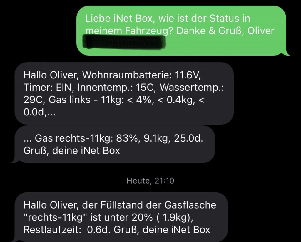 Die Kommunikation findet sowohl über Bluetooth als auch, bei verbauter Nano SIM Karte, per SMS statt. Die Kommunikation per SMS ist schon recht witzig, man kann in der iNet Box festlegen, wie man angesprochen werden möchte und die iNet Box ist höflich und auf den Punkt.