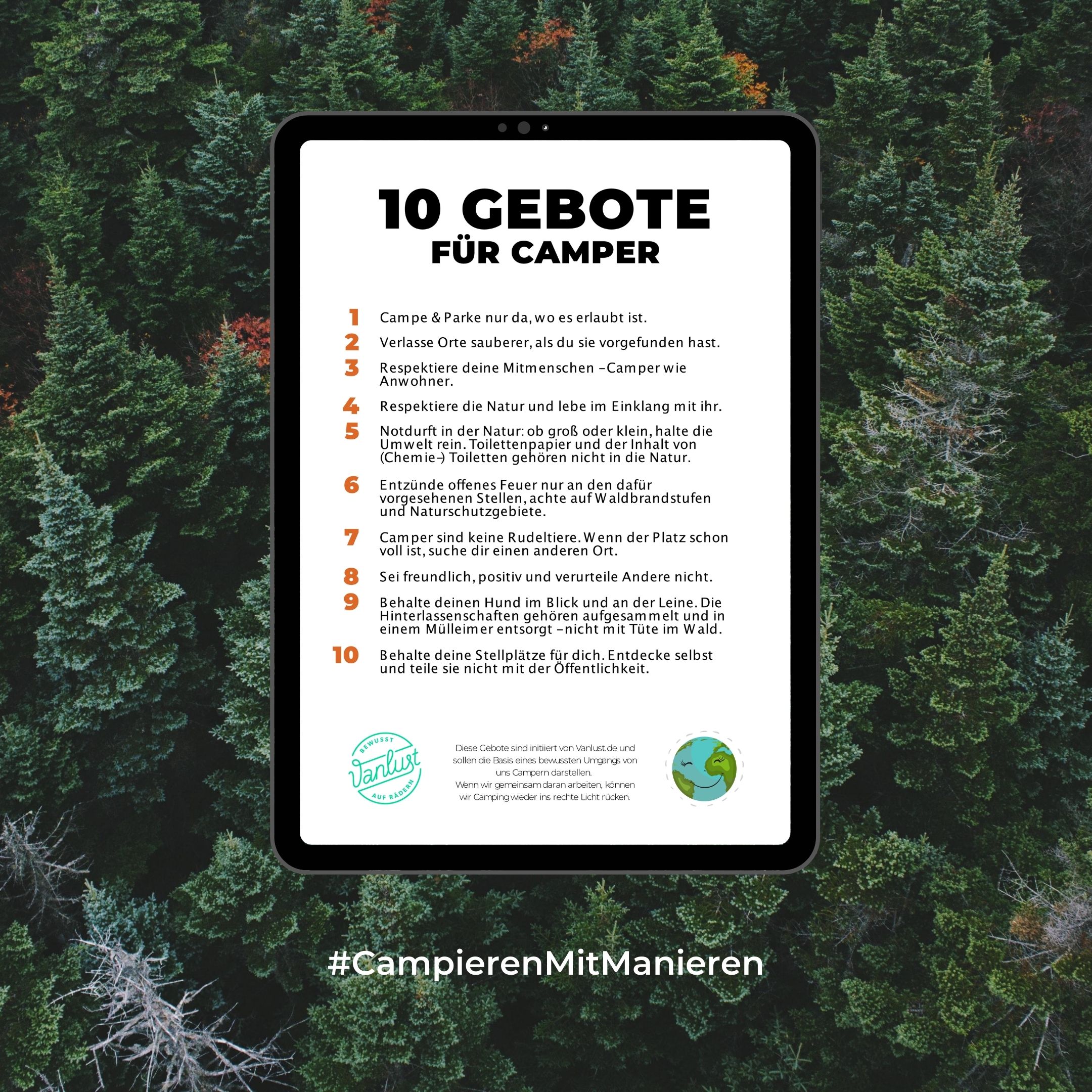 Die 10 Gebote für Camper, VanLifer und Freisteher wurden von Vanlust aufgestellt. Die Camperszene boomt aktuell und durch die vielen Neulinge unter uns berichten die Medien nicht nur positiv über uns. Ich selbst schließe mich der Aktion ebenfalls an und möchte diese auch hier zum Thema machen. Die Kampagne #CampierenMitManieren sollte für jeden Camper und nicht Camper zur Normalität werden.