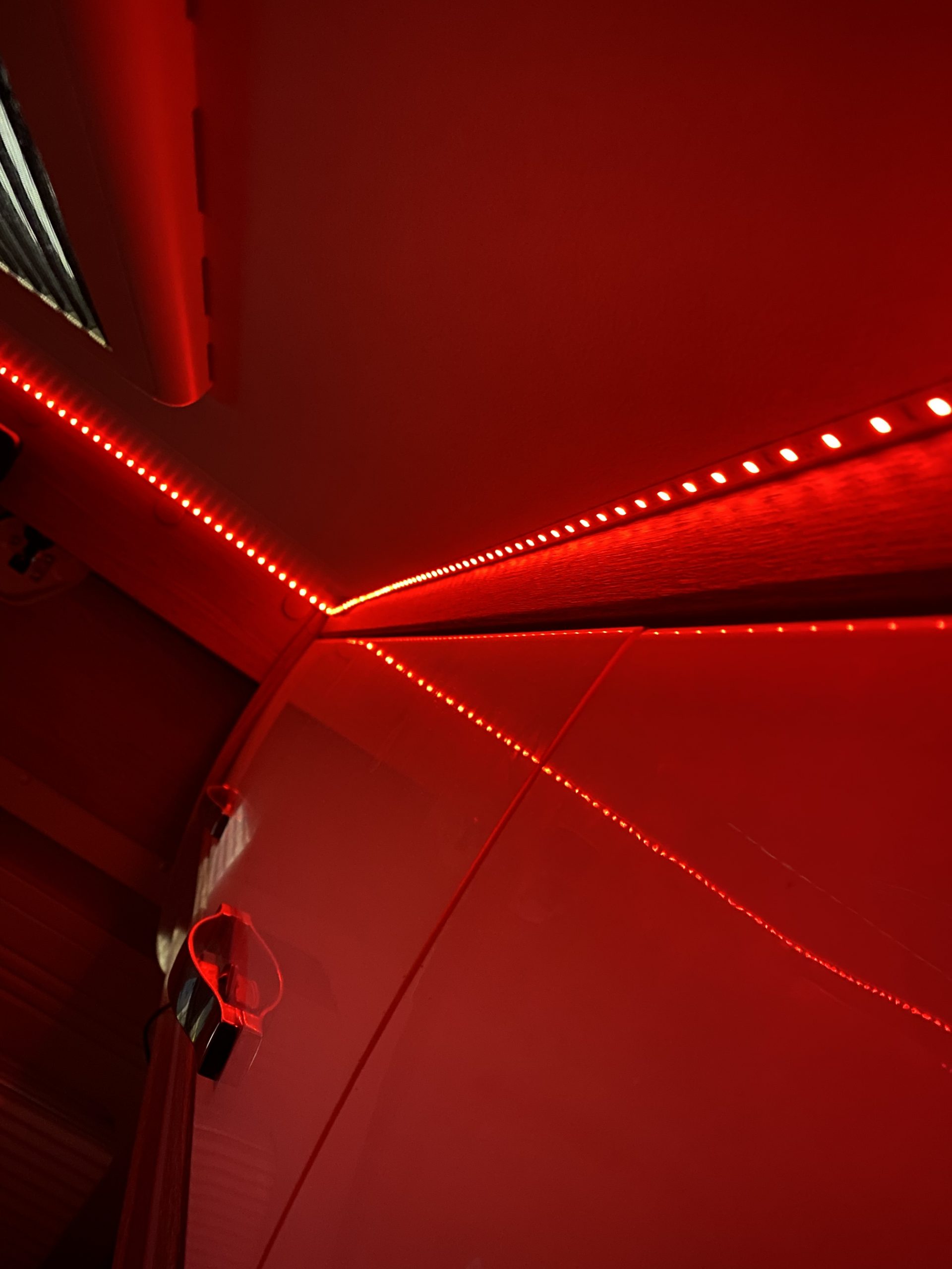 Ich habe nun in meinem Van ein wenig mit LED Stripes dekoriert. Jeweils 5 Meter mit roten LED an einem 12 Volt Dimmer der mit einer Fernbedienung gesteuert werden kann.