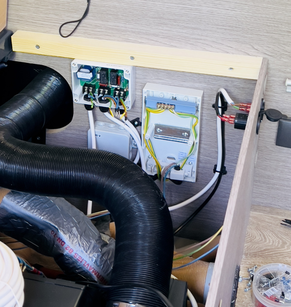 Tino hatte zum Glück noch einen kurzen Slot für mich frei und diese Umbauarbeit wurde bereits bei Kai von TravelCampingLiving vollzogen, so dass er weiß was ihn erwartet. Unter der Sitzbank ist nun von Wattstunde eine Netzvorrangschaltung verbaut, diese wird entweder vom Landstrom (bevorzugt) oder direkt von der EcoFlow River Pro versorgt. Dadurch habe ich ohne Landstrom 230 Volt an allen Steckdosen. Der ganze Umbau war nach gut 2 1/2 Stunden erledigt und ich konnte alles wieder einräumen und anschließen.