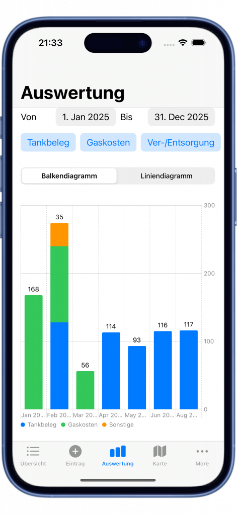 Einfache Dateneingabe: Erfasse Ausgaben für Tankbelege, Gaskosten, Service- und sonstige Kosten mit nur wenigen Klicks.